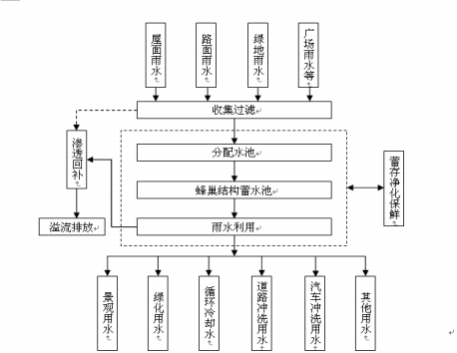 補”、“溢流排放”四個子系統(tǒng)組成,如下圖所示。雨水分別通過由砂基透水 磚鋪裝形成的海綿型吸水地面,以及砂基透水路緣石、濾水溝及溝蓋板等構成 的“面式排水”結構收集過濾;過濾后的雨水由導水管流入分配水池,進而流 入蜂巢結構蓄水池,雨水經(jīng)過蜂巢結構的層層過濾,得以凈化,可用于景觀、 綠化、道路沖洗等方面;過量雨水溢流進入“滲透回補”子系統(tǒng),每個滲水井 既起到滯留調(diào)蓄作用,同時又能起到滲透回補地下水作用;當降雨量超過上述 系統(tǒng)的容量時,超量溢流的雨水則通過連通到市政管網(wǎng)的已有管道,實現(xiàn)錯峰排放。