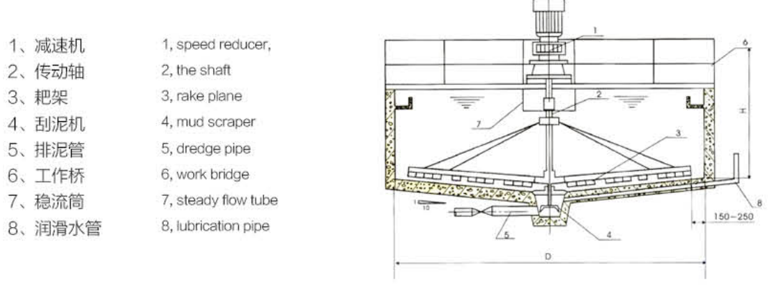 ?GZX型中心傳動刮吸泥機廣泛用于給水工程中的沉淀池排泥,整機載荷都作用在工作橋中心。污水經中心穩流筒布水后流向周邊溢水槽,隨著流速的降低,污水中的懸浮物被分離而沉降于池底,由刮板將沉淀的污泥刮集到中心集泥槽中,靠靜水壓力將其從污泥管排出。